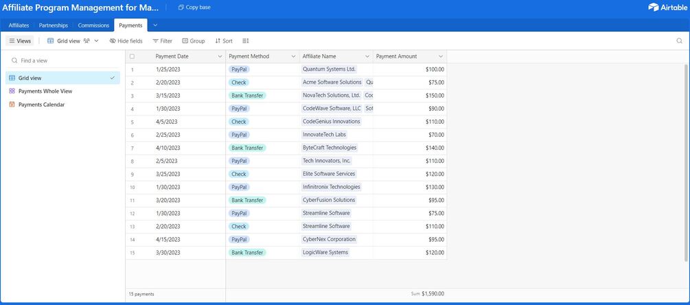 - Payment Records: Manage affiliate payments effortlessly by recording payment dates, methods, and payment amounts.